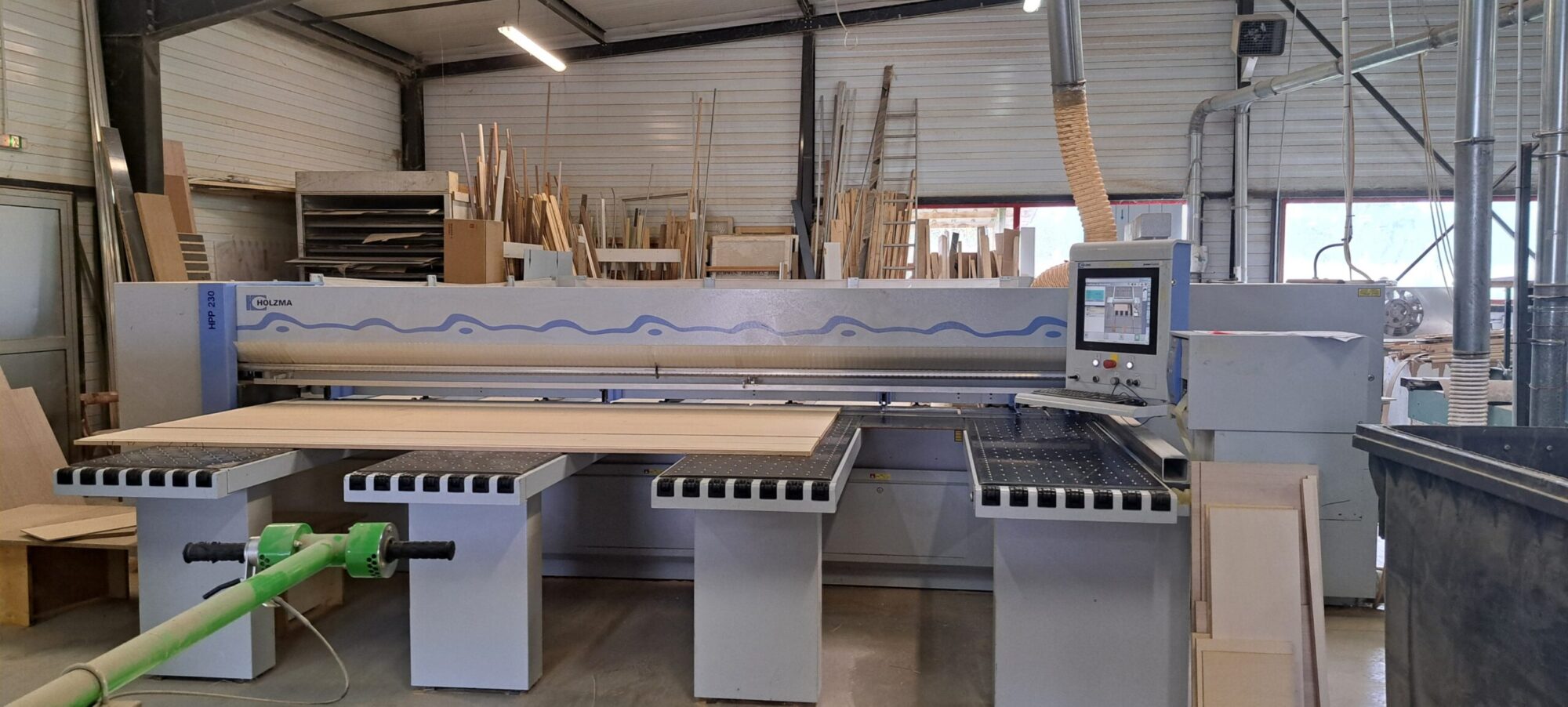 La scie à format numérique permet un grand débit de panneaux par heure et simplifie la manipulation. Sa connexion directe au bureau d’étude centralise les débits pour chaque mobilier. Dans une optique de développement durable, un logiciel automatisé limite les chutes inutilisées. Marque : HOMAG. Cette technologie améliore la précision des découpes et optimise le temps de production. Elle permet également une meilleure organisation du travail entre le bureau d’étude et l’atelier.