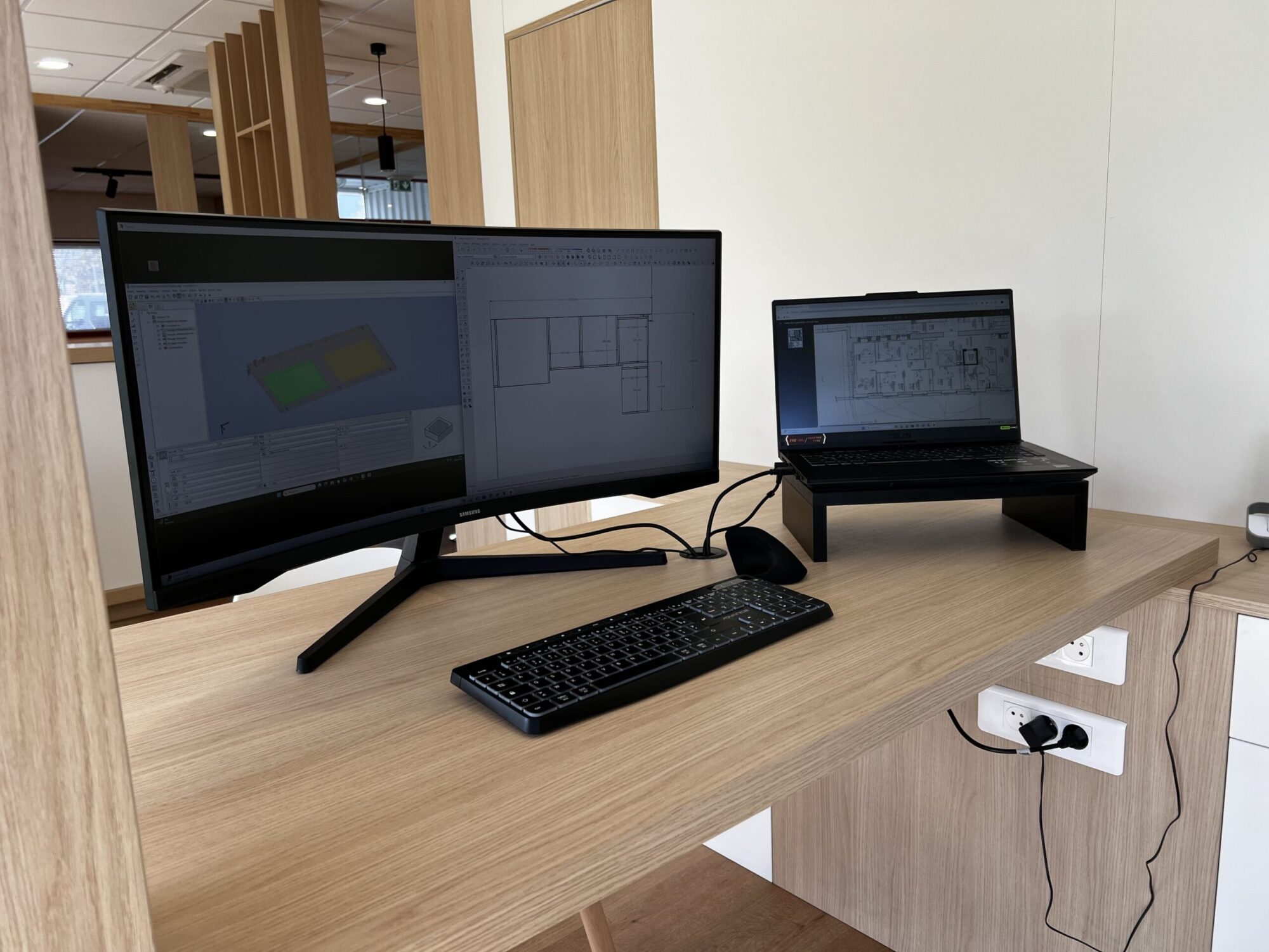 Les ordinateurs sont également directement en lien avec l’atelier de fabrication. Cette connexion facilite la communication entre les concepteurs et les équipes de production. Les plans et les informations techniques peuvent ainsi être transmis rapidement, ce qui permet d’assurer un suivi précis du projet et d’optimiser la réalisation des mobiliers.